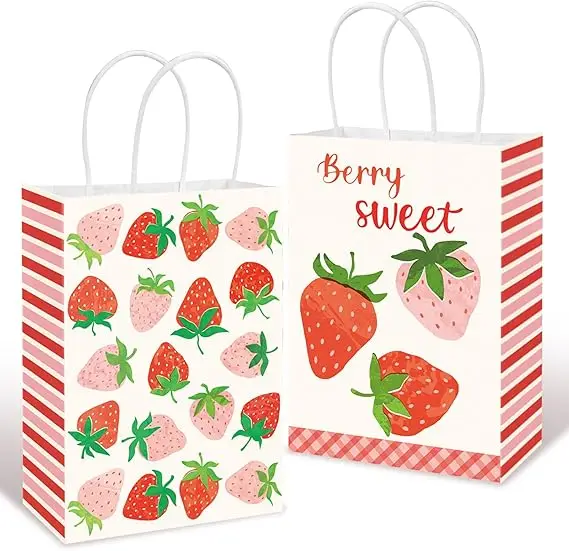 - Complete Set: 24 paper gift bags with handles, 2 sweet strawberry designs (12 each).